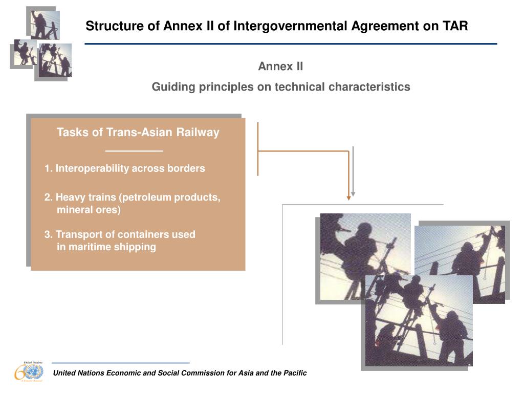 Annex II Guiding principles on technical characteristics Tasks of Trans-Asian Railway 1. Interoperability across borders 2. Heavy trains (petroleum products, mineral ores) 3. Transport of containers used in maritime shipping United Nations Economic and Social Commission for Asia and the Pacific Structure of Annex II of Intergovernmental Agreement on TAR TAR Line capacity Vehicle loading gauge Authorized mass per axle Coupling system Braking systems Standards for terminals