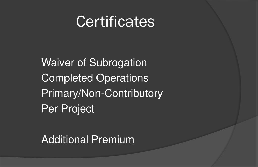 Certificates Waiver of Subrogation Completed Operations Primary/Non-Contributory Per Project Additional Premium