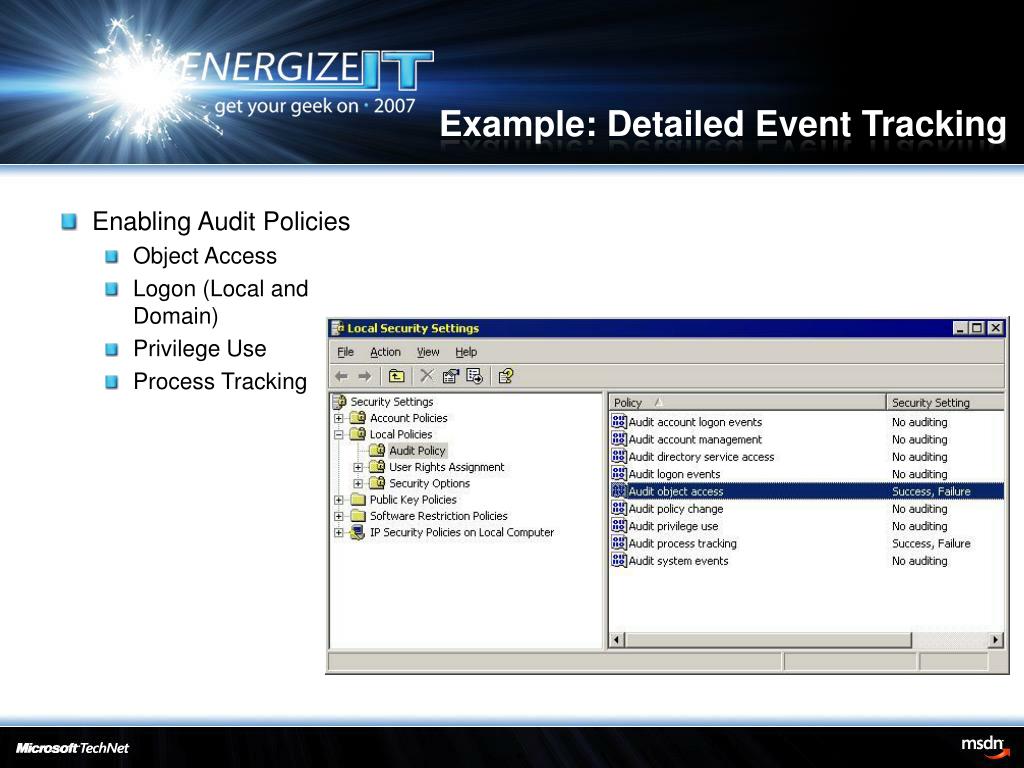 Example: Detailed Event Tracking • Enabling Audit Policies • Object Access • Logon (Local and Domain) • Privilege Use • Process Tracking