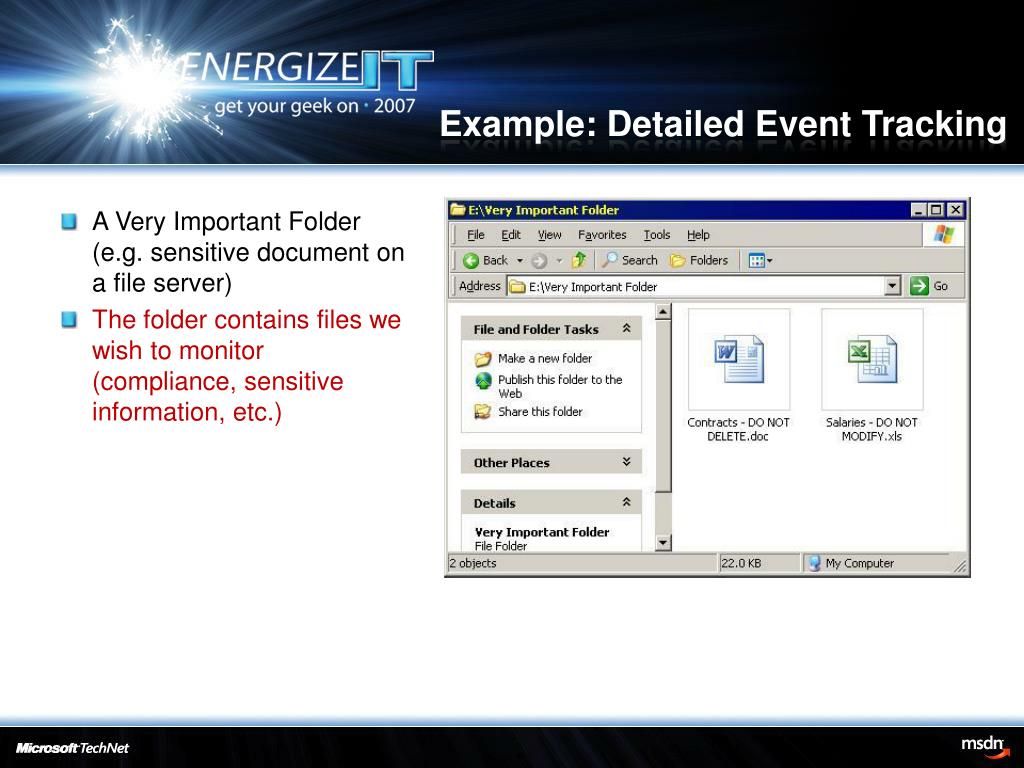Example: Detailed Event Tracking A Very Important Folder (e.g. sensitive document on a file server) The folder contains files we wish to monitor (compliance, sensitive information, etc.)