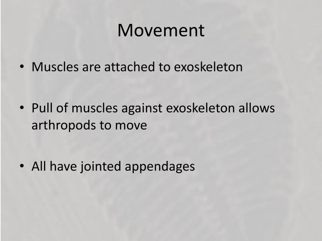 Movement • Muscles are attached to exoskeleton • Pull of muscles against exoskeleton allows arthropods to move • All have jointed appendages