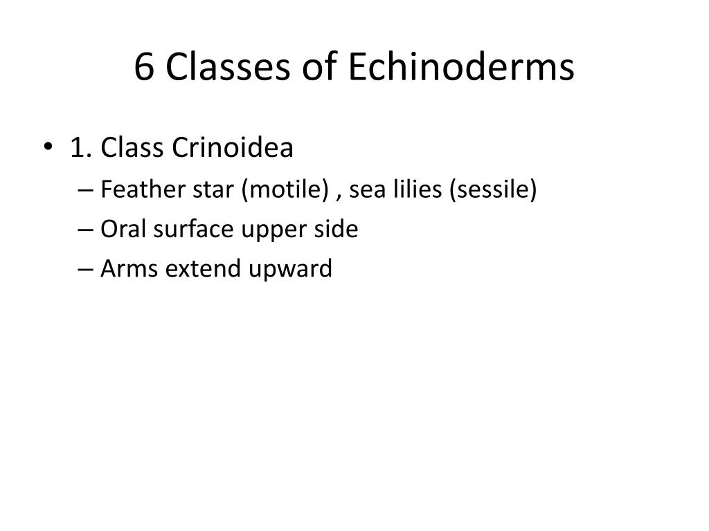 6 Classes of Echinoderms • 1. Class Crinoidea • Feather star (motile) , sea lilies (sessile) • Oral surface upper side • Arms extend upward