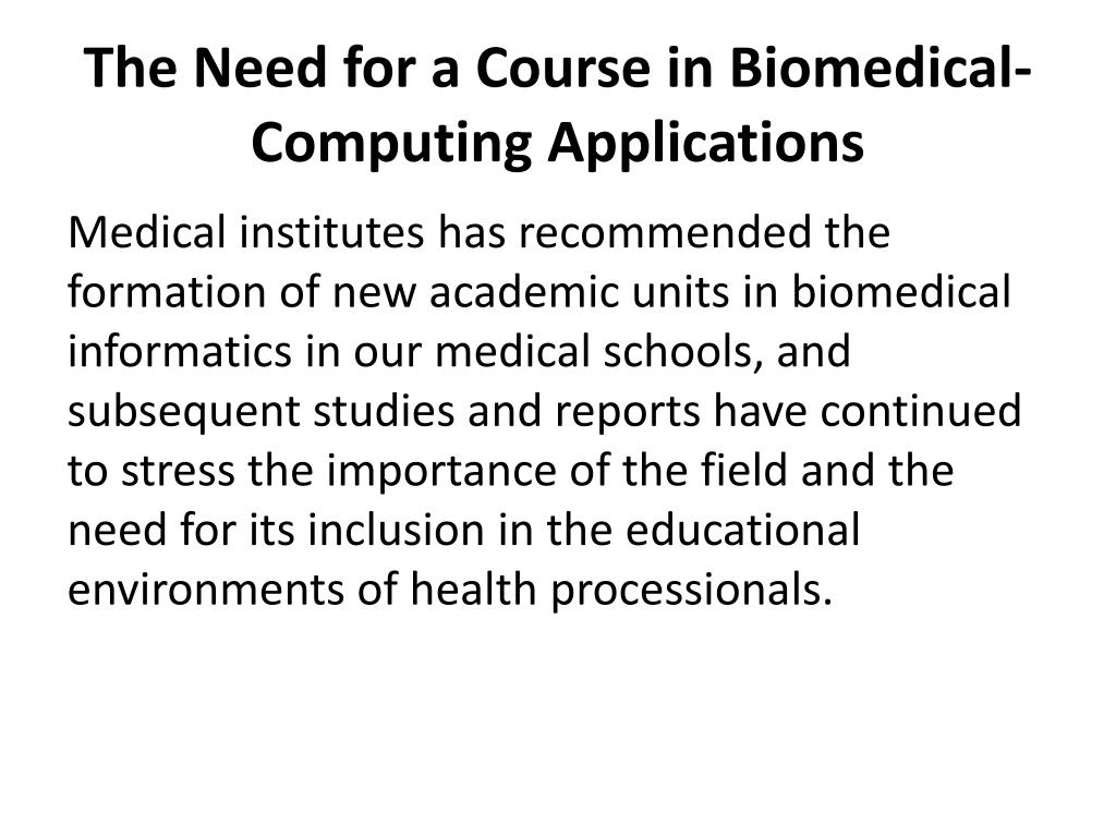 The Need for a Course in Biomedical-Computing Applications Medical institutes has recommended the formation of new academic units in biomedical informatics in our medical schools, and subsequent studies and reports have continued to stress the importance of the field and the need for its inclusion in the educational environments of health processionals.
