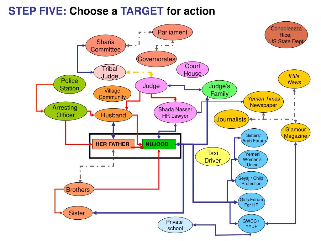 STEP FIVE: Example of a TARGET for action Condoleezza Rice, US State Dept Parliament Sharia Committee Governorates Court House Tribal Judge IRIN News Police Station Judge Judge’s Family Village Community Yemen Times Newspaper Arresting Officer Shada Nasser HR Lawyer Husband Journalists Glamour Magazine Sisters’ Arab Forum HER FATHER NUJOOD Taxi Driver Yemeni Women’s Union Seyaj / Child Protection Brothers Girls Forum For HR Sister GWCC / YYDF Private school