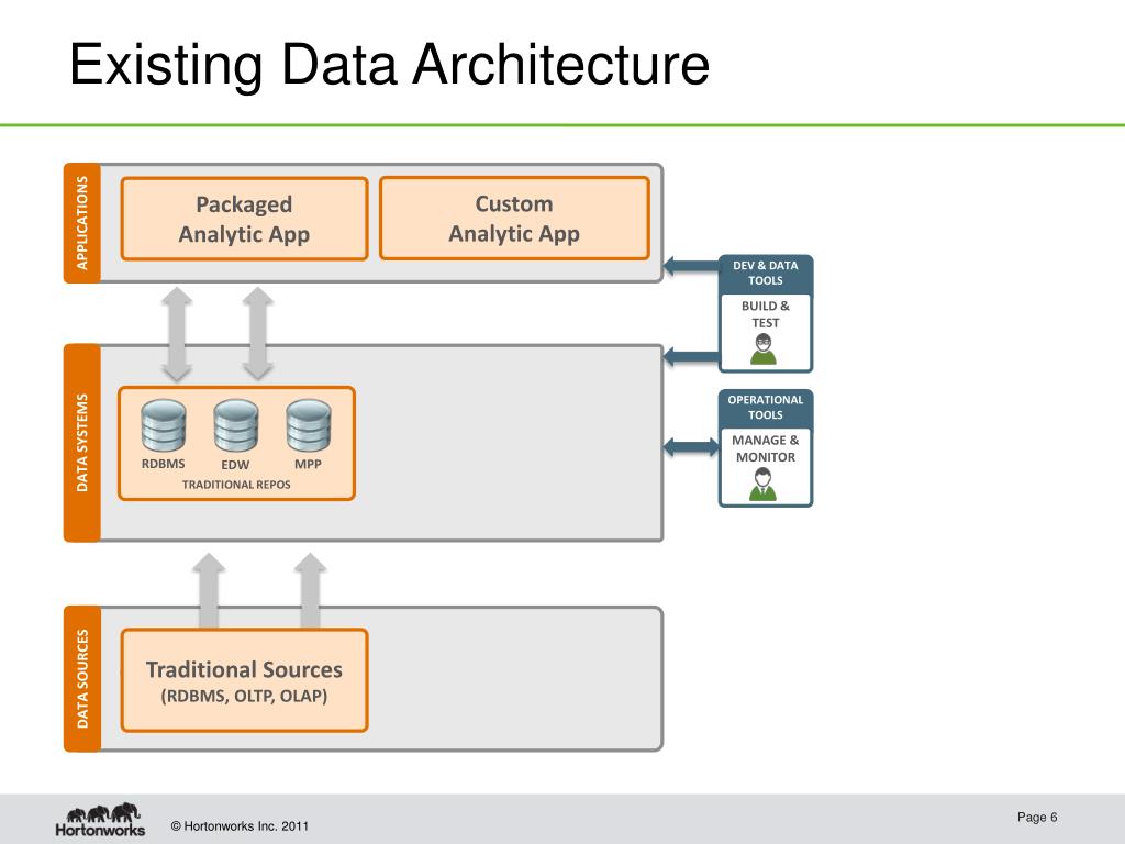 Existing Data Architecture APPLICATIONS Custom Analytic App Packaged Analytic App OPERATIONAL TOOLS DEV & DATA TOOLS MANAGE & MONITOR BUILD & TEST DATA SYSTEMS TRADITIONAL REPOS MPP RDBMS EDW DATA SOURCES Traditional Sources (RDBMS, OLTP, OLAP) OLTP, POS SYSTEMS