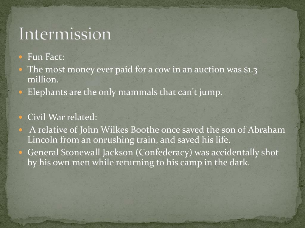 Intermission • Fun Fact: • The most money ever paid for a cow in an auction was $1.3 million. • Elephants are the only mammals that can't jump. • Civil War related: • A relative of John Wilkes Boothe once saved the son of Abraham Lincoln from an onrushing train, and saved his life. • General Stonewall Jackson (Confederacy) was accidentally shot by his own men while returning to his camp in the dark.
