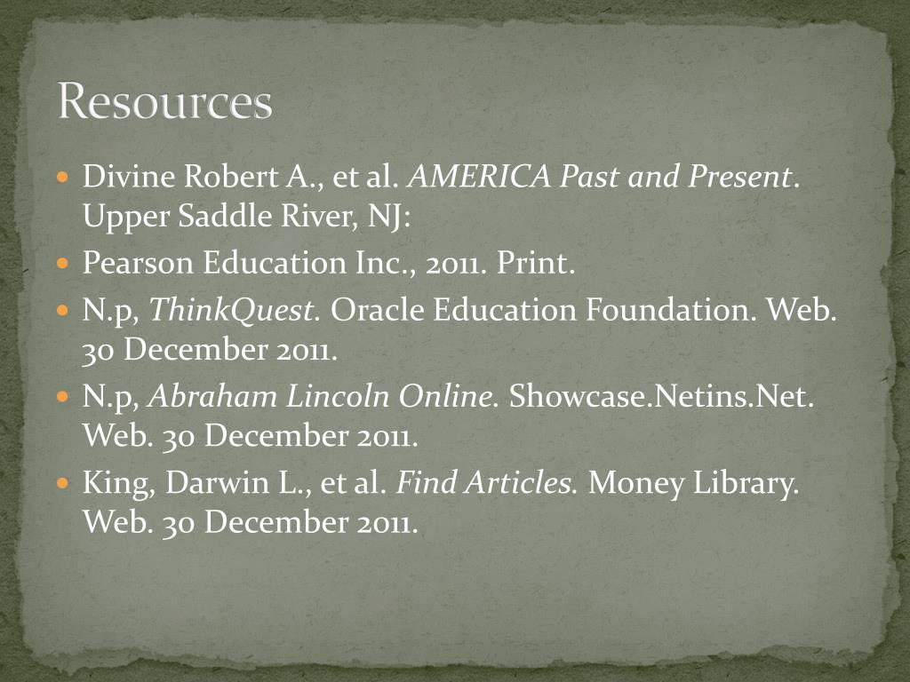 Resources • Divine Robert A., et al. AMERICA Past and Present. Upper Saddle River, NJ: • Pearson Education Inc., 2011. Print. • N.p, ThinkQuest. Oracle Education Foundation. Web. 30 December 2011. • N.p, Abraham Lincoln Online. Showcase.Netins.Net. Web. 30 December 2011. • King, Darwin L., et al. Find Articles. Money Library. Web. 30 December 2011.