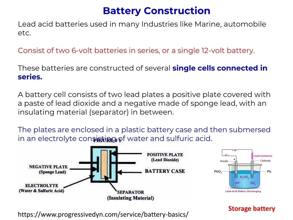 Battery Construction Lead acid batteries used in many Industries like Marine, automobile etc. Consist of two 6-volt batteries in series, or a single 12-volt battery. These batteries are constructed of several single cells connected in series. A battery cell consists of two lead plates a positive plate covered with a paste of lead dioxide and a negative made of sponge lead, with an insulating material (separator) in between. The plates are enclosed in a plastic battery case and then submersed in an electrolyte consisting of water and sulfuric acid. Storage battery https://www.progressivedyn.com/service/battery-basics/