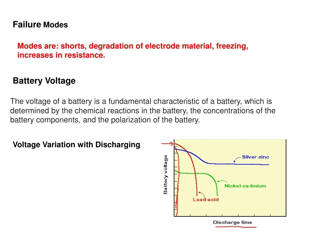 Failure Modes Modes are: shorts, degradation of electrode material, freezing, increases in resistance. Battery Voltage The voltage of a battery is a fundamental characteristic of a battery, which is determined by the chemical reactions in the battery, the concentrations of the battery components, and the polarization of the battery. Voltage Variation with Discharging