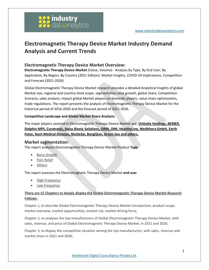 Global Electromagnetic Therapy Device Market u2013 Growth, Trends And Forecast (2021 u2013 2026) By Types, By Application, By Regions and By Key Players u2013 Orthofix Holdings,BEMER,Dolphin MPS,Curatronic and others.<br>