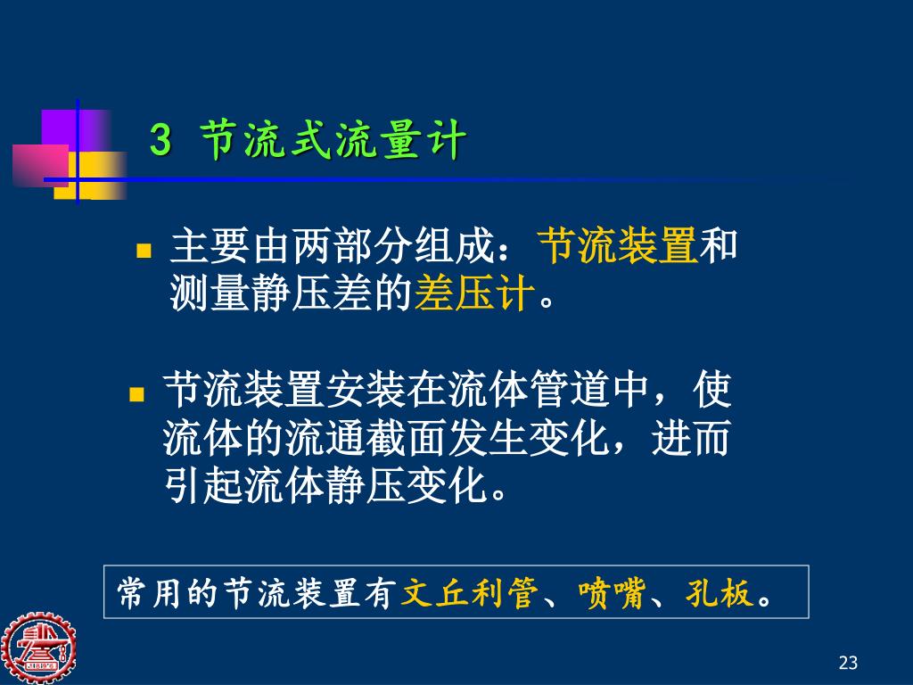 3 节流式流量计 • 主要由两部分组成:节流装置和测量静压差的差压计。 • 节流装置安装在流体管道中,使流体的流通截面发生变化,进而引起流体静压变化。 常用的节流装置有文丘利管、喷嘴、孔板。