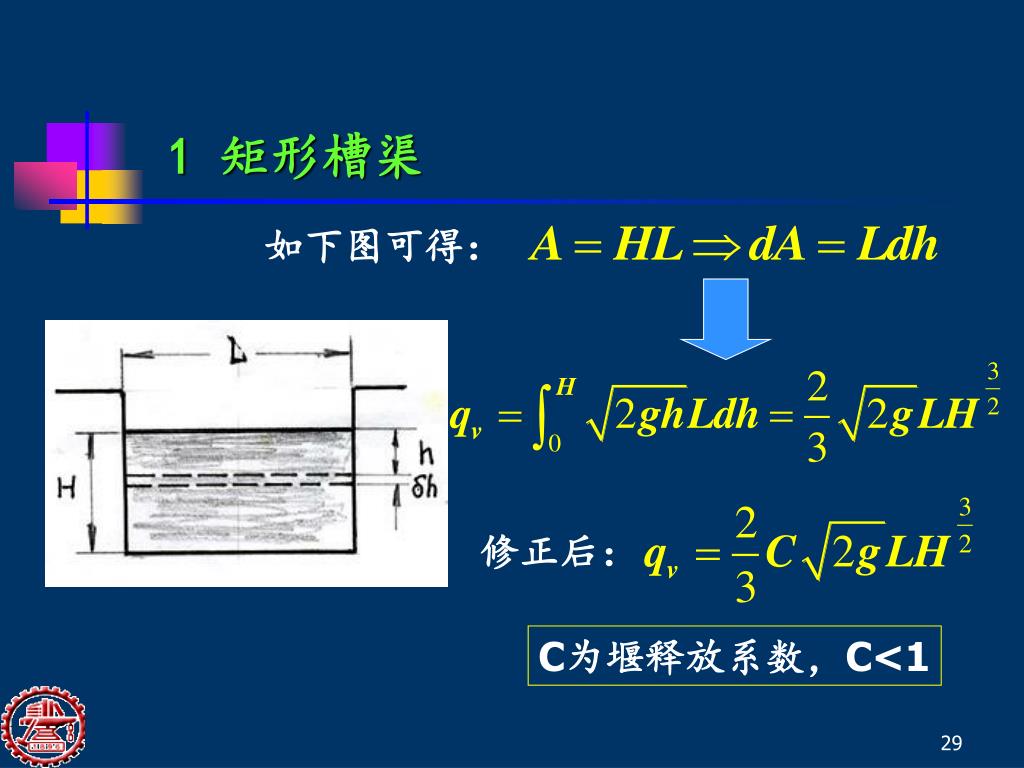 1 矩形槽渠 如下图可得: 修正后: C为堰释放系数,C<1