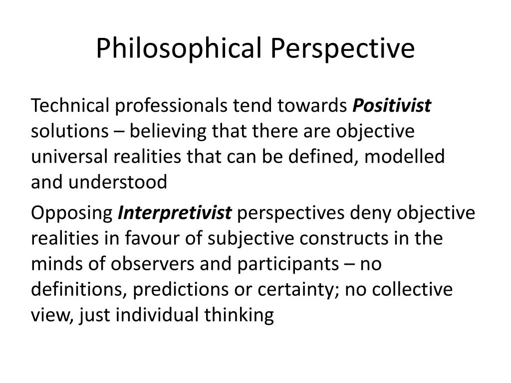 Philosophical Perspective Technical professionals tend towards Positivist solutions – believing that there are objective universal realities that can be defined, modelled and understood Opposing Interpretivist perspectives deny objective realities in favour of subjective constructs in the minds of observers and participants – no definitions, predictions or certainty; no collective view, just individual thinking