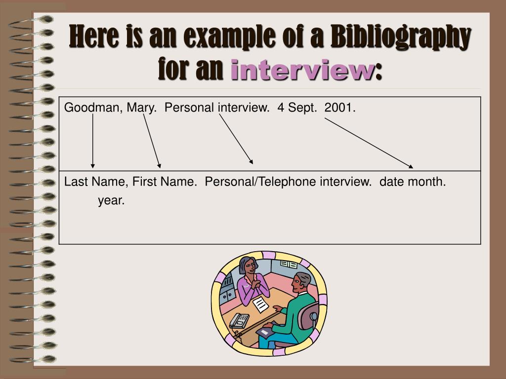 Lastly, an interview Take out a piece of paper and use the information provided to write a proper bibliography for this source: (Just click on the mouse to reveal the correct answer) Person: Mary Finch Date of interview: January 6, 2004 Personal interview ANSWER: Finch, Mary. Personal interview. 6 Jan .2004.