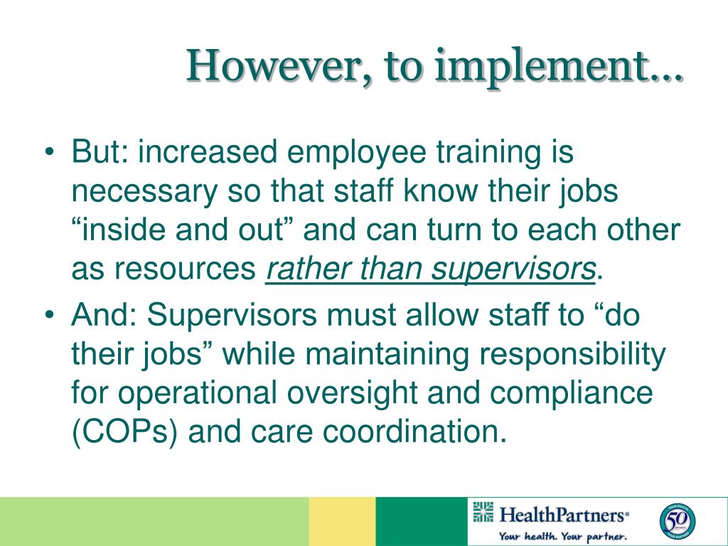However, to implement… • But: increased employee training is necessary so that staff know their jobs “inside and out” and can turn to each other as resources rather than supervisors. • And: Supervisors must allow staff to “do their jobs” while maintaining responsibility for operational oversight and compliance (COPs) and care coordination.