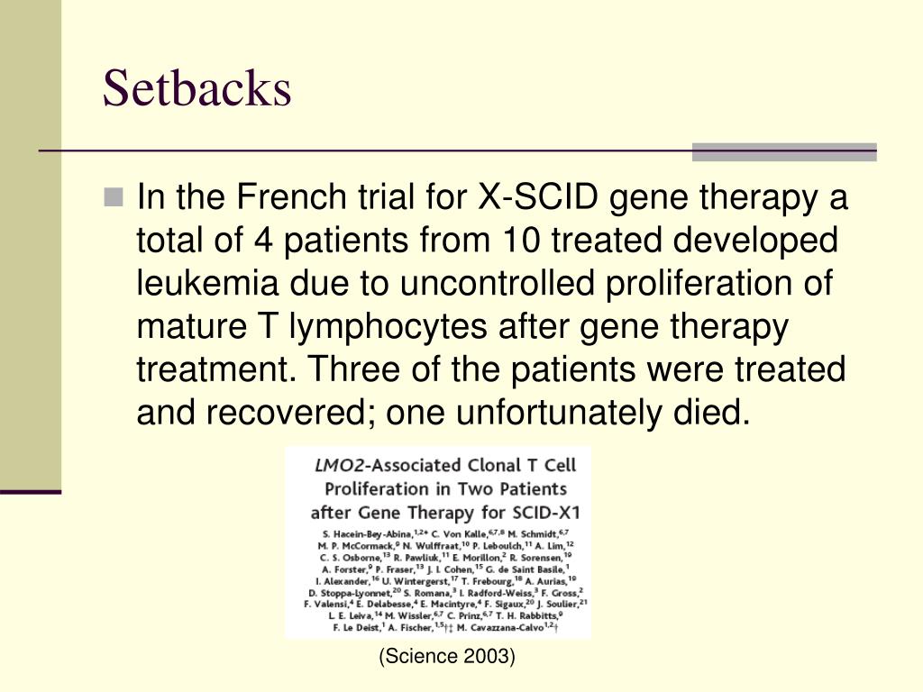 Setbacks • In the French trial for X-SCID gene therapy a total of 4 patients from 10 treated developed leukemia due to uncontrolled proliferation of mature T lymphocytes after gene therapy treatment. Three of the patients were treated and recovered; one unfortunately died. (Science 2003)