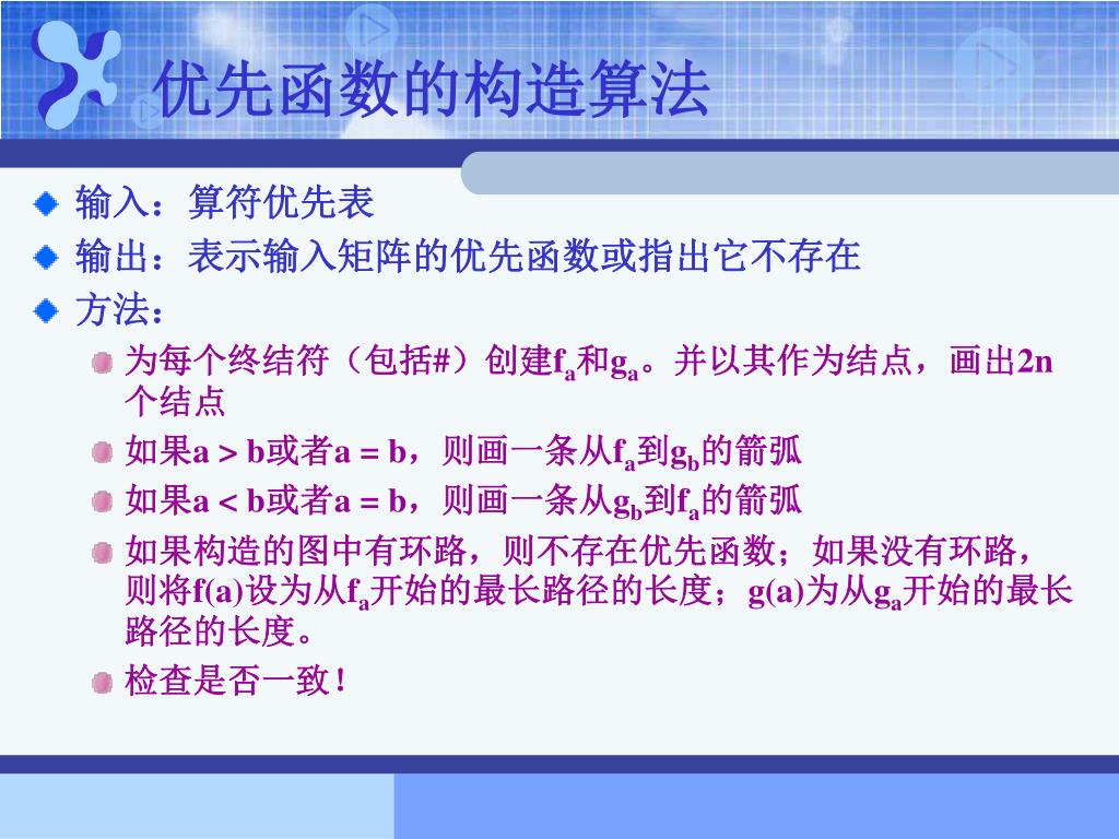 优先函数 • 优先函数的计算方法 • 1.f(a) < g(b),如果a < b • 2.f(a) = g(b),如果a = b • 3.f(a) > g(b),如果a > b • 优先函数的问题 • 使得优先关系表中的空白项是模糊的 • 使得错误的发现被推迟 • 优先关系表的存储方式 • 矩阵表示:准确直观;需要大量内存空间(n+1)2 • 优先函数:需要内存空间小2(n+1);不利于出错处理