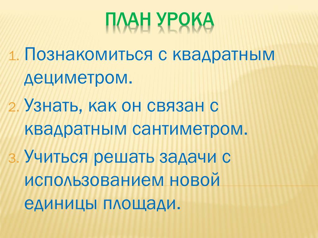 Познакомиться с квадратным дециметром. Узнать, как он связан с квадратным сантиметром. Учиться решать задачи с использованием новой единицы площади. План урока