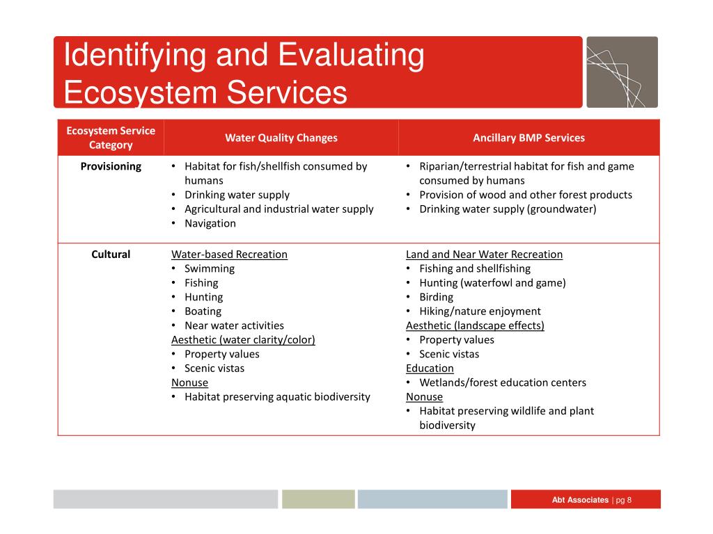 Market-based Approaches Hydrological Benefits Flood damages Groundwater quantity Drinking water treatment (groundwater) Avoided cost of infrastructure maintenance and expansion Avoided cost of stream restoration Water storage for beneficial use • Water Quality • Commercial fish/shellfish harvest • Drinking water treatment • Reservoir dredging • Navigational waterways dredging • Agricultural/industrial water supply • Air • Electricity savings • Technology alternatives to carbon sequestration • Technology alternatives to air pollutant removal • Employment Effects • Regional Economic Impacts • Input output models