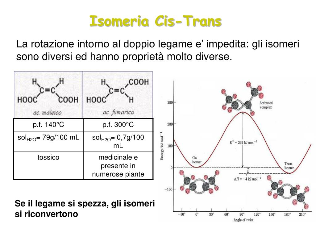 Isomeria Cis-Trans La rotazione intorno al doppio legame e’ impedita: gli isomeri sono diversi ed hanno proprietà molto diverse. Se il legame si spezza, gli isomeri si riconvertono