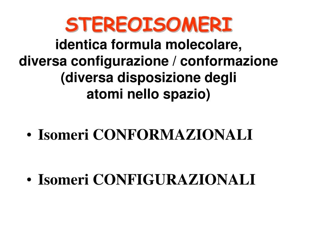 STEREOISOMERIidentica formula molecolare,diversa configurazione / conformazione (diversa disposizione degli atomi nello spazio) • Isomeri CONFORMAZIONALI • Isomeri CONFIGURAZIONALI
