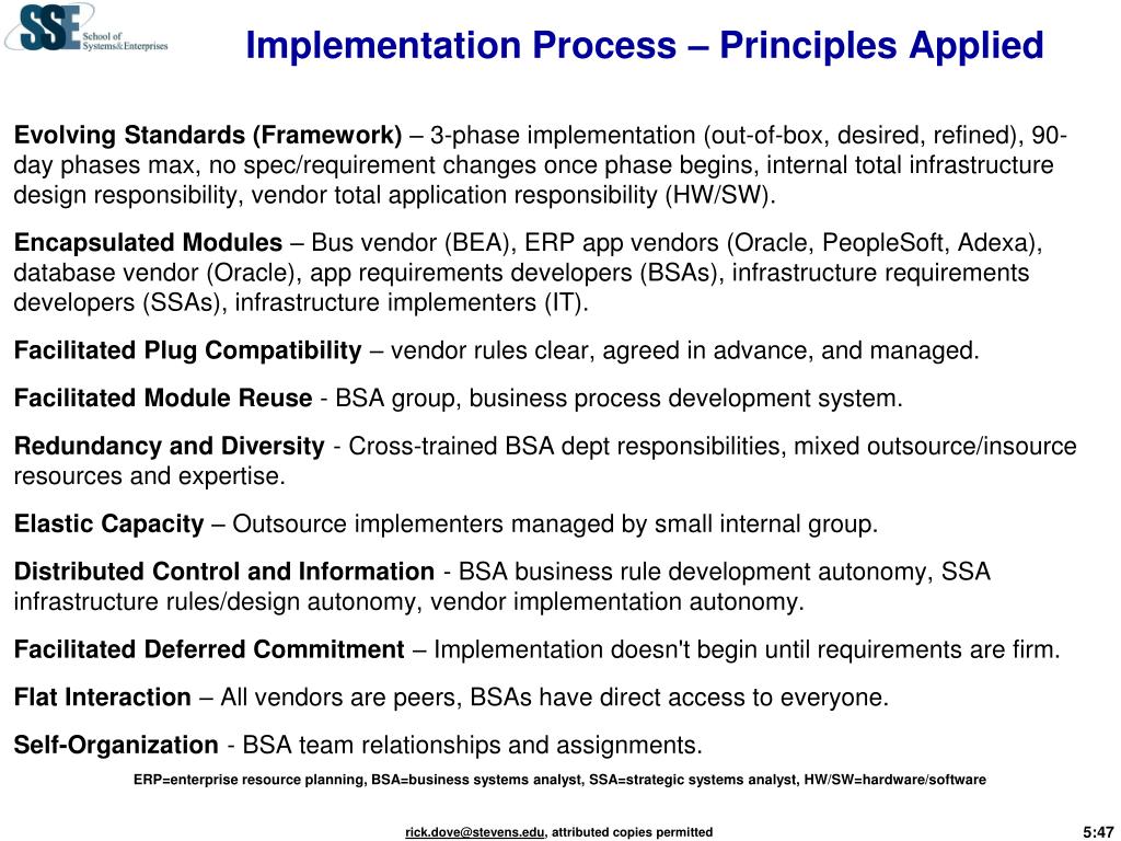 Implementation Process – Principles Applied • Evolving Standards (Framework) – 3-phase implementation (out-of-box, desired, refined), 90-day phases max, no spec/requirement changes once phase begins, internal total infrastructure design responsibility, vendor total application responsibility (HW/SW). • Encapsulated Modules – Bus vendor (BEA), ERP app vendors (Oracle, PeopleSoft, Adexa), database vendor (Oracle), app requirements developers (BSAs), infrastructure requirements developers (SSAs), infrastructure implementers (IT). • Facilitated Plug Compatibility – vendor rules clear, agreed in advance, and managed. • Facilitated Module Reuse - BSA group, business process development system. • Redundancy and Diversity - Cross-trained BSA dept responsibilities, mixed outsource/insource resources and expertise. • Elastic Capacity – Outsource implementers managed by small internal group. • Distributed Control and Information - BSA business rule development autonomy, SSA infrastructure rules/design autonomy, vendor implementation autonomy. • Facilitated Deferred Commitment – Implementation doesn't begin until requirements are firm. • Flat Interaction – All vendors are peers, BSAs have direct access to everyone. • Self-Organization - BSA team relationships and assignments. ERP=enterprise resource planning, BSA=business systems analyst, SSA=strategic systems analyst, HW/SW=hardware/software