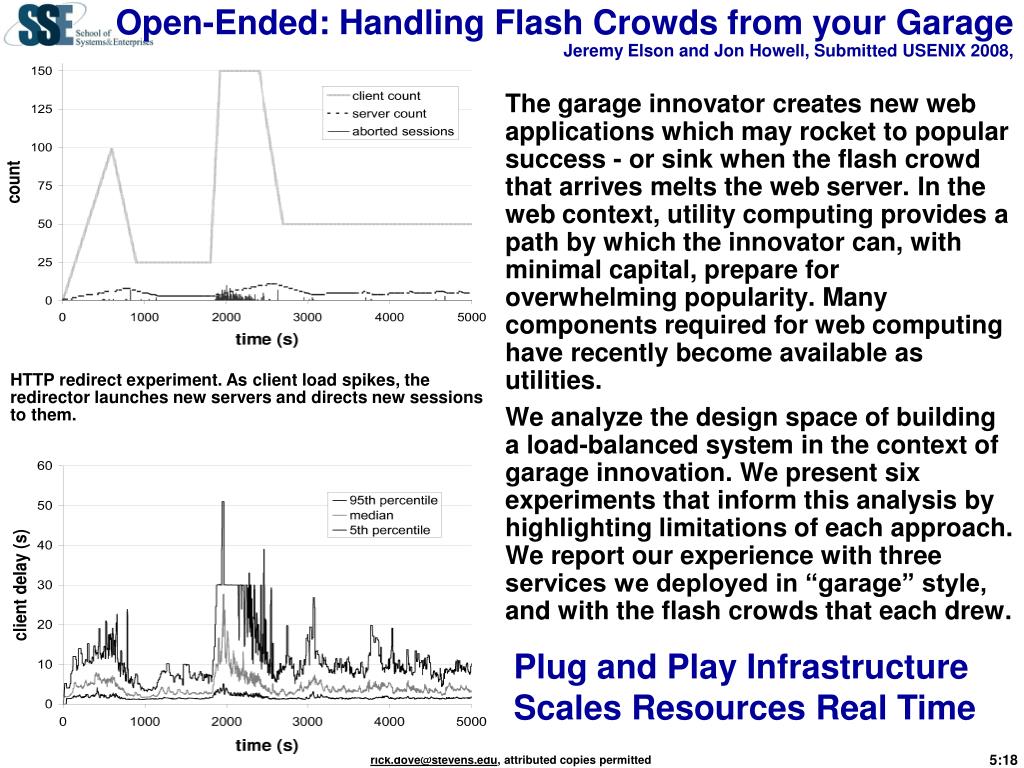 Open-Ended: Handling Flash Crowds from your GarageJeremy Elson and Jon Howell, Submitted USENIX 2008, • The garage innovator creates new web applications which may rocket to popular success - or sink when the flash crowd that arrives melts the web server. In the web context, utility computing provides a path by which the innovator can, with minimal capital, prepare for overwhelming popularity. Many components required for web computing have recently become available as utilities. • We analyze the design space of building a load-balanced system in the context of garage innovation. We present six experiments that inform this analysis by highlighting limitations of each approach. We report our experience with three services we deployed in “garage” style, and with the flash crowds that each drew. HTTP redirect experiment. As client load spikes, the redirector launches new servers and directs new sessions to them. Plug and Play Infrastructure Scales Resources Real Time