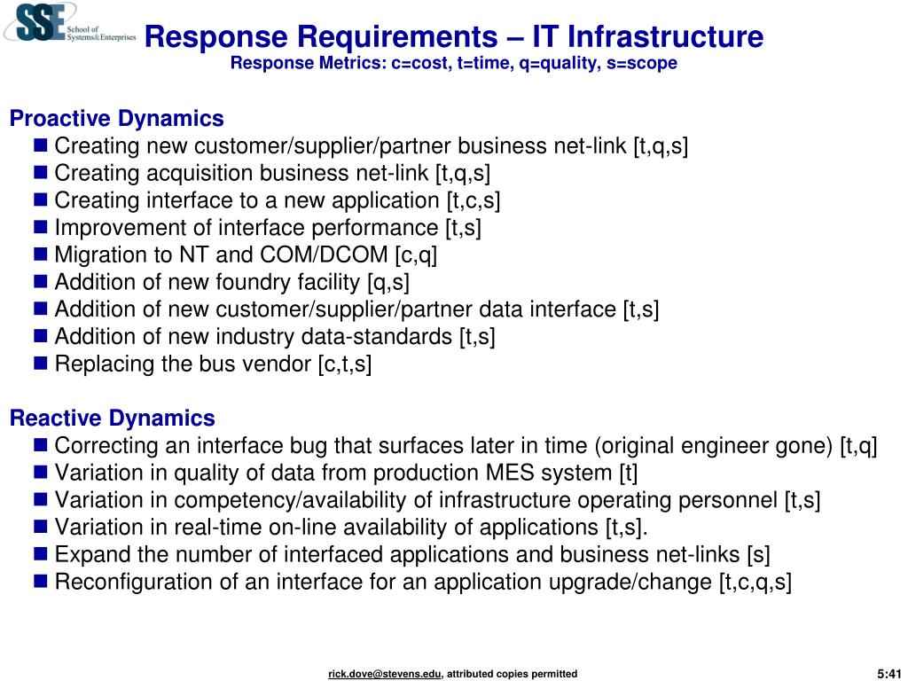 Response Requirements – IT InfrastructureResponse Metrics: c=cost, t=time, q=quality, s=scope • Proactive Dynamics • Creating new customer/supplier/partner business net-link [t,q,s] • Creating acquisition business net-link [t,q,s] • Creating interface to a new application [t,c,s] • Improvement of interface performance [t,s] • Migration to NT and COM/DCOM [c,q] • Addition of new foundry facility [q,s] • Addition of new customer/supplier/partner data interface [t,s] • Addition of new industry data-standards [t,s] • Replacing the bus vendor [c,t,s] • Reactive Dynamics • Correcting an interface bug that surfaces later in time (original engineer gone) [t,q] • Variation in quality of data from production MES system [t] • Variation in competency/availability of infrastructure operating personnel [t,s] • Variation in real-time on-line availability of applications [t,s]. • Expand the number of interfaced applications and business net-links [s] • Reconfiguration of an interface for an application upgrade/change [t,c,q,s]