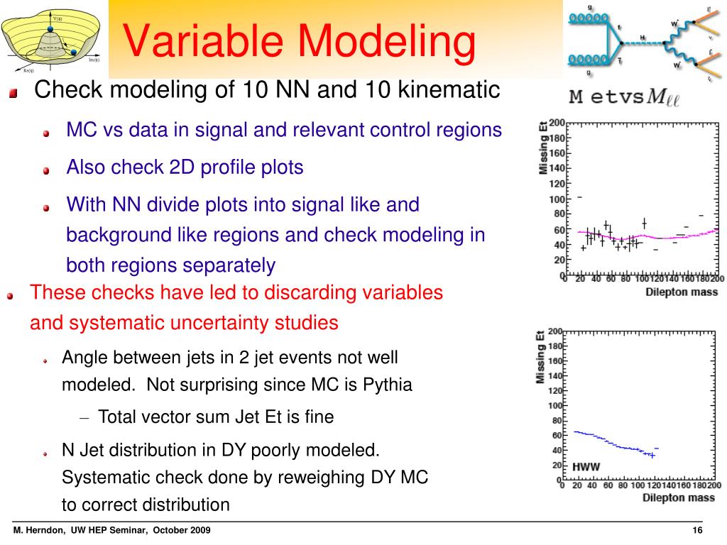 Variable Modeling • Check modeling of 10 NN and 10 kinematic • MC vs data in signal and relevant control regions • Also check 2D profile plots • With NN divide plots into signal like and background like regions and check modeling in both regions separately • These checks have led to discarding variables and systematic uncertainty studies • Angle between jets in 2 jet events not well modeled. Not surprising since MC is Pythia • Total vector sum Jet Et is fine • N Jet distribution in DY poorly modeled. Systematic check done by reweighing DY MC to correct distribution