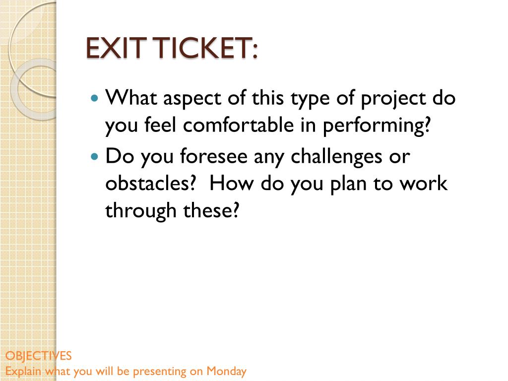 EXIT TICKET: • What aspect of this type of project do you feel comfortable in performing? • Do you foresee any challenges or obstacles? How do you plan to work through these? OBJECTIVES Explain what you will be presenting on Monday