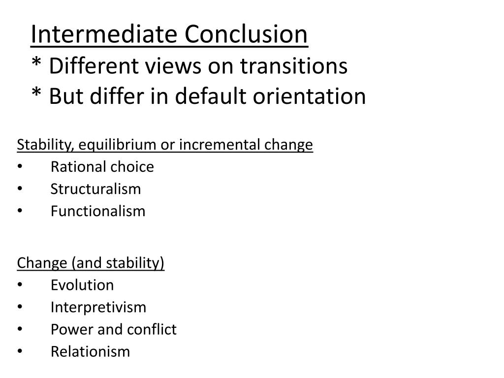 Intermediate Conclusion* Different views on transitions* But differ in default orientation Stability, equilibrium or incremental change • Rational choice • Structuralism • Functionalism Change (and stability) • Evolution • Interpretivism • Power and conflict • Relationism