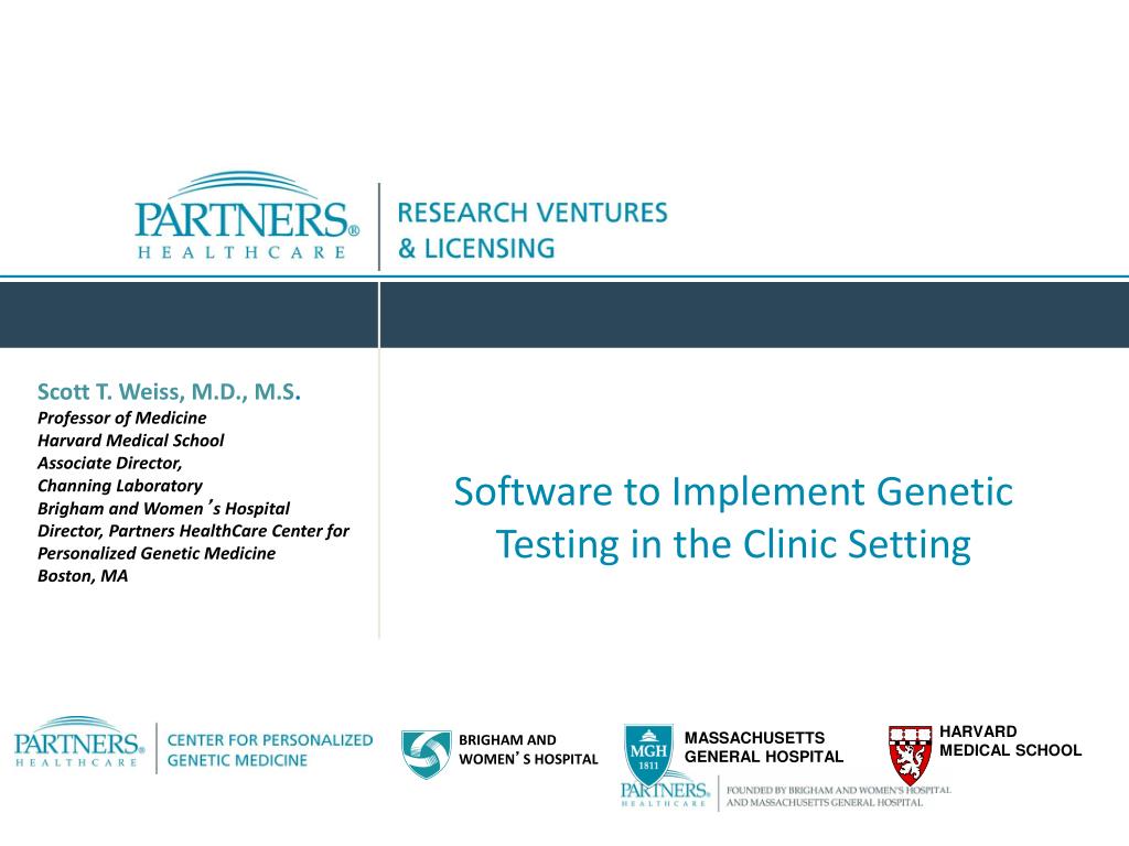 HARVARD MEDICAL SCHOOL BRIGHAM AND WOMEN’S HOSPITAL Scott T. Weiss, M.D., M.S. Professor of Medicine Harvard Medical School Associate Director, Channing Laboratory Brigham and Women’s Hospital Director, Partners HealthCare Center for Personalized Genetic Medicine Boston, MA Software to Implement Genetic Testing in the Clinic Setting MASSACHUSETTS GENERAL HOSPITAL