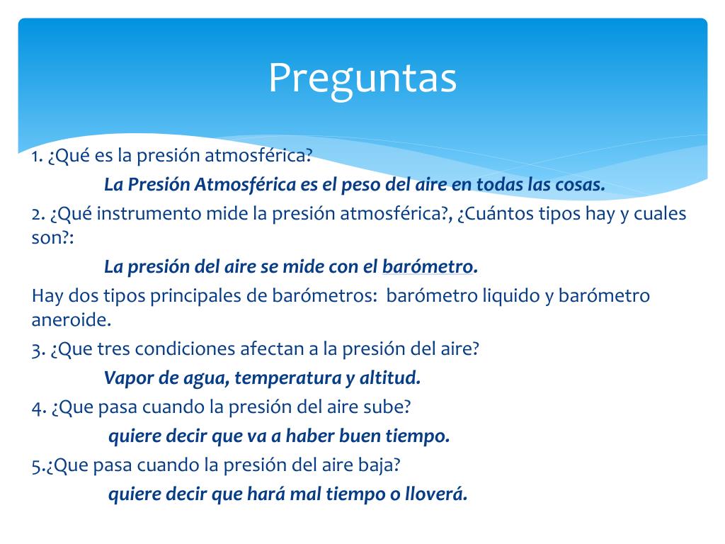 Preguntas 1. ¿Qué es la presión atmosférica? La Presión Atmosférica es el peso del aire en todas las cosas. 2. ¿Qué instrumento mide la presión atmosférica?, ¿Cuántos tipos hay y cuales son?: La presión del aire se mide con el barómetro. Hay dos tipos principales de barómetros: barómetro liquido y barómetro aneroide. 3. ¿Que tres condiciones afectan a la presión del aire? Vapor de agua, temperatura y altitud. 4. ¿Que pasa cuando la presión del aire sube? quiere decir que va a haber buen tiempo. 5.¿Que pasa cuando la presión del aire baja? quiere decir que hará mal tiempo o lloverá.