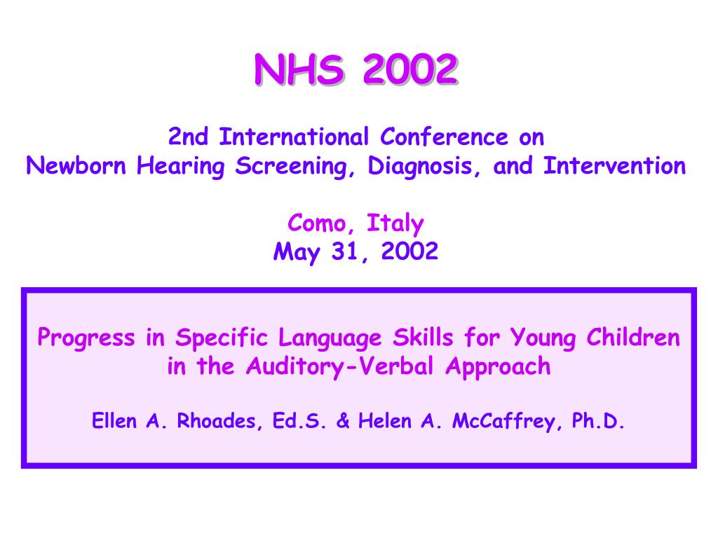 NHS 2002 2nd International Conference on Newborn Hearing Screening, Diagnosis, and Intervention Como, Italy May 31, 2002. Progress in Specific Language Skills for Young Children in the Auditory-Verbal Approach Ellen A. Rhoades, Ed.S. & Helen A. McCaffrey, Ph.D. .