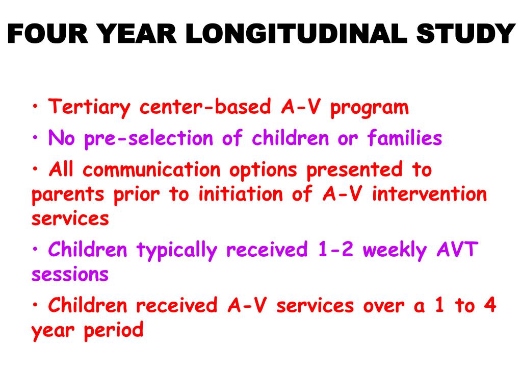 FOUR YEAR LONGITUDINAL STUDY • Tertiary center-based A-V program • No pre-selection of children or families • All communication options presented to parents prior to initiation of A-V intervention services • Children typically received 1-2 weekly AVT sessions • Children received A-V services over a 1 to 4 year period