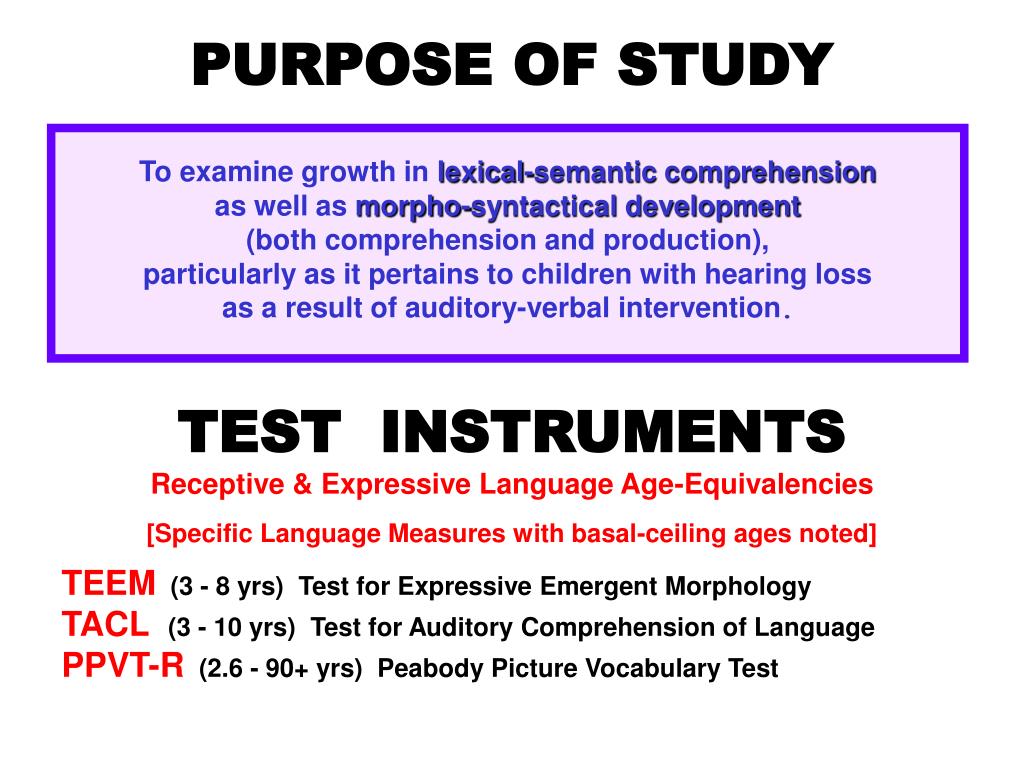 PURPOSE OF STUDY To examine growth in lexical-semantic comprehension as well as morpho-syntactical development (both comprehension and production), particularly as it pertains to children with hearing loss as a result of auditory-verbal intervention. TEST INSTRUMENTSReceptive & Expressive Language Age-Equivalencies • [Specific Language Measures with basal-ceiling ages noted] • TEEM (3 - 8 yrs) Test for Expressive Emergent Morphology • TACL(3 - 10 yrs) Test for Auditory Comprehension of Language • PPVT-R (2.6 - 90+ yrs) Peabody Picture Vocabulary Test