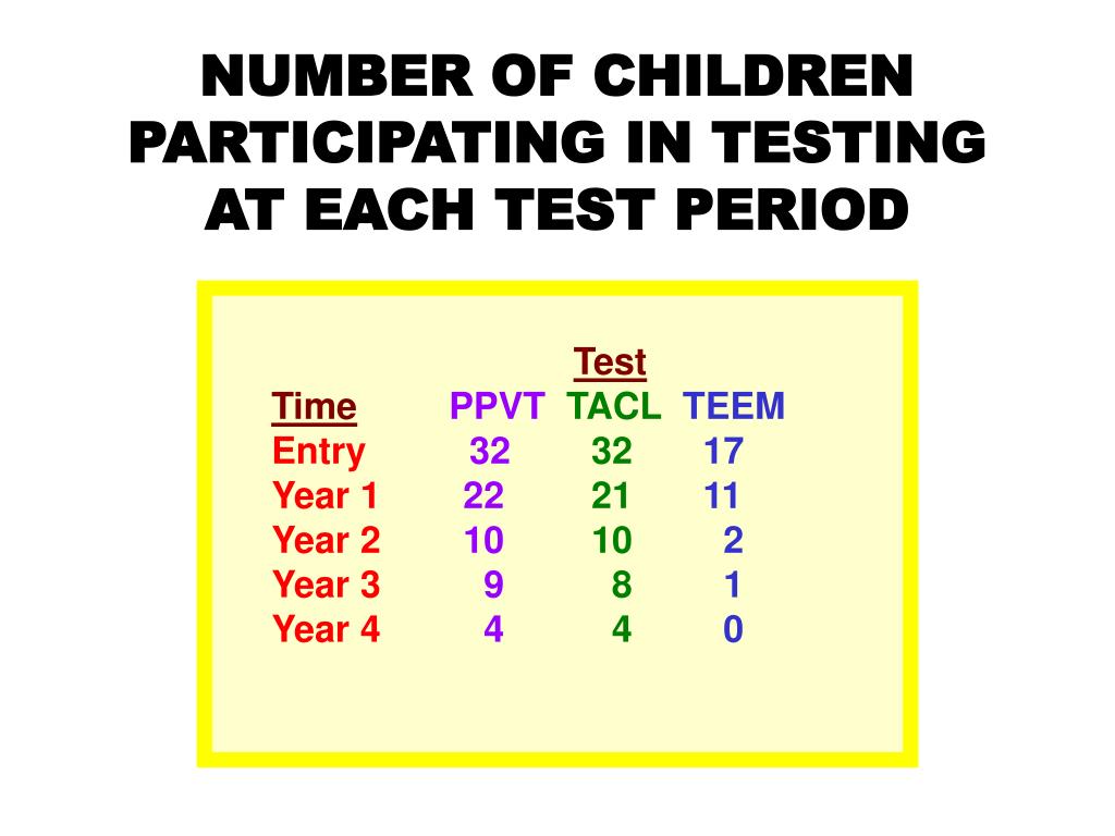 NUMBER OF CHILDREN PARTICIPATING IN TESTING AT EACH TEST PERIOD • Test • TimePPVT TACL TEEM • Entry32 3217 • Year 1 222111 • Year 2 10102 • Year 3 9 81 • Year 4 440