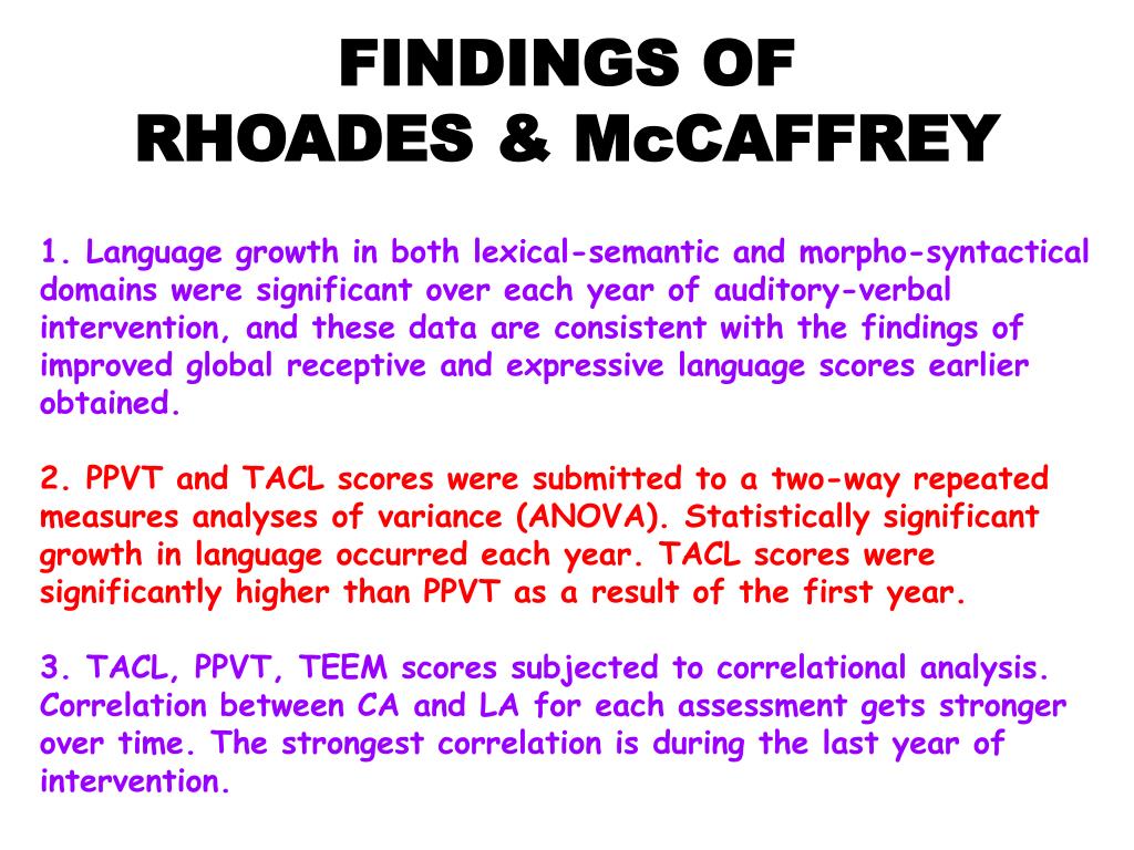 FINDINGS OF RHOADES & McCAFFREY 1. Language growth in both lexical-semantic and morpho-syntactical domains were significant over each year of auditory-verbal intervention, and these data are consistent with the findings of improved global receptive and expressive language scores earlier obtained. 2. PPVT and TACL scores were submitted to a two-way repeated measures analyses of variance (ANOVA). Statistically significant growth in language occurred each year. TACL scores were significantly higher than PPVT as a result of the first year. 3. TACL, PPVT, TEEM scores subjected to correlational analysis. Correlation between CA and LA for each assessment gets stronger over time. The strongest correlation is during the last year of intervention.