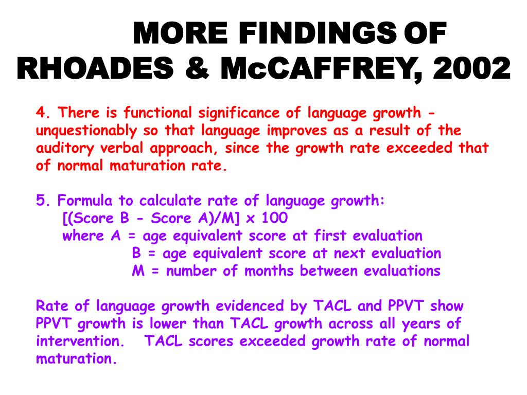 MORE FINDINGSOF RHOADES & McCAFFREY, 2002 • 4. There is functional significance of language growth - unquestionably so that language improves as a result of the auditory verbal approach, since the growth rate exceeded that of normal maturation rate. • 5. Formula to calculate rate of language growth: • [(Score B - Score A)/M] x 100 • where A = age equivalent score at first evaluation • B = age equivalent score at next evaluation • M = number of months between evaluations • Rate of language growth evidenced by TACL and PPVT show PPVT growth is lower than TACL growth across all years of intervention. TACL scores exceeded growth rate of normal maturation.