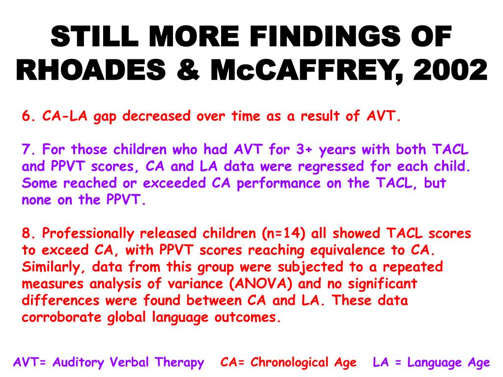 STILL MORE FINDINGS OF RHOADES & McCAFFREY, 2002 6. CA-LA gap decreased over time as a result of AVT. 7. For those children who had AVT for 3+ years with both TACL and PPVT scores, CA and LA data were regressed for each child. Some reached or exceeded CA performance on the TACL, but none on the PPVT. 8. Professionally released children (n=14) all showed TACL scores to exceed CA, with PPVT scores reaching equivalence to CA. Similarly, data from this group were subjected to a repeated measures analysis of variance (ANOVA) and no significant differences were found between CA and LA. These data corroborate global language outcomes. AVT= Auditory Verbal Therapy CA= Chronological Age LA = Language Age