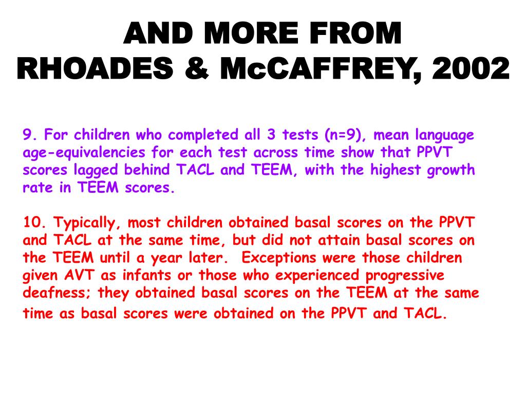 AND MORE FROM RHOADES & McCAFFREY, 2002 9. For children who completed all 3 tests (n=9), mean language age-equivalencies for each test across time show that PPVT scores lagged behind TACL and TEEM, with the highest growth rate in TEEM scores. 10. Typically, most children obtained basal scores on the PPVT and TACL at the same time, but did not attain basal scores on the TEEM until a year later. Exceptions were those children given AVT as infants or those who experienced progressive deafness; they obtained basal scores on the TEEM at the same time as basal scores were obtained on the PPVT and TACL.