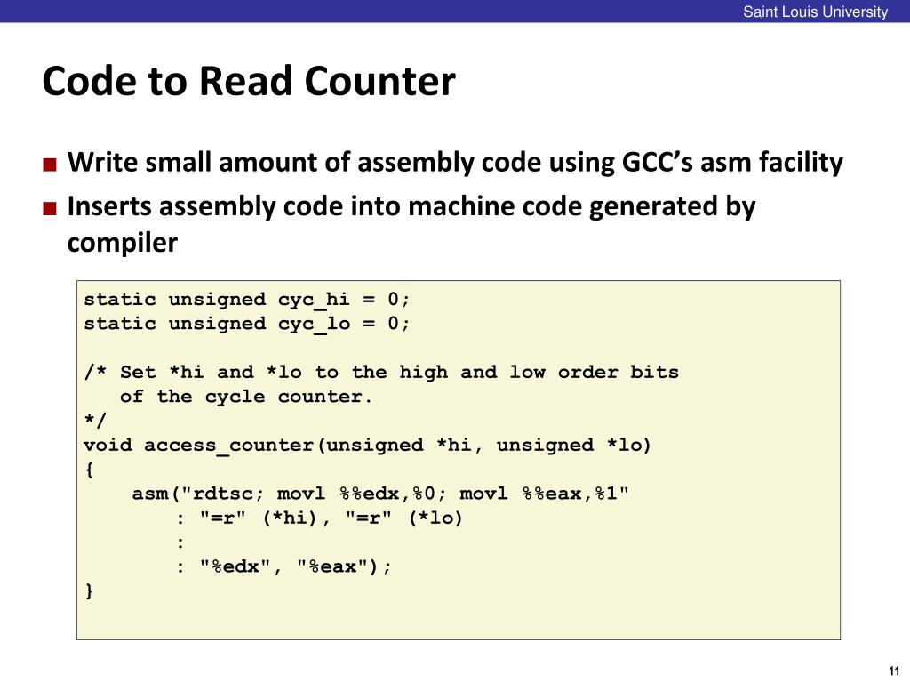Saint Louis University Assembly Code Example • Time Stamp Counter • Special 64-bit register in Intel-compatible machines • Incremented every clock cycle • Read with rdtsc instruction • Application • Measure time (in clock cycles) required by procedure double t; start_counter(); P(); t = get_counter(); printf("P required %f clock cycles\n", t);