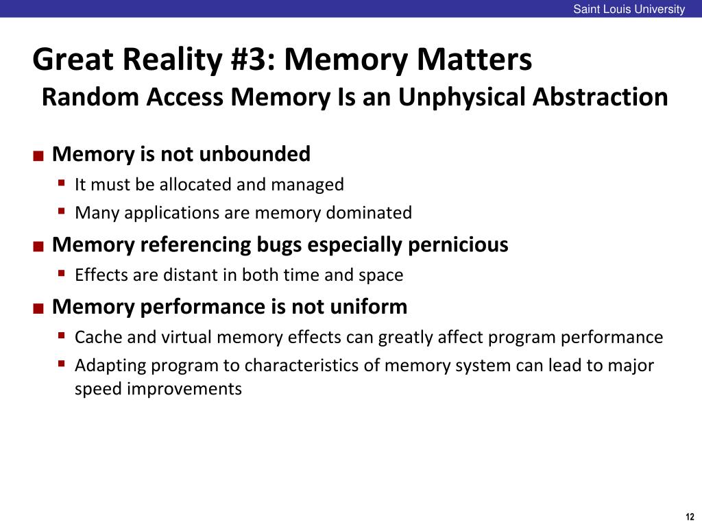 Saint Louis University Great Reality #3: Memory MattersRandom Access Memory Is an Unphysical Abstraction • Memory is not unbounded • It must be allocated and managed • Many applications are memory dominated • Memory referencing bugs especially pernicious • Effects are distant in both time and space • Memory performance is not uniform • Cache and virtual memory effects can greatly affect program performance • Adapting program to characteristics of memory system can lead to major speed improvements