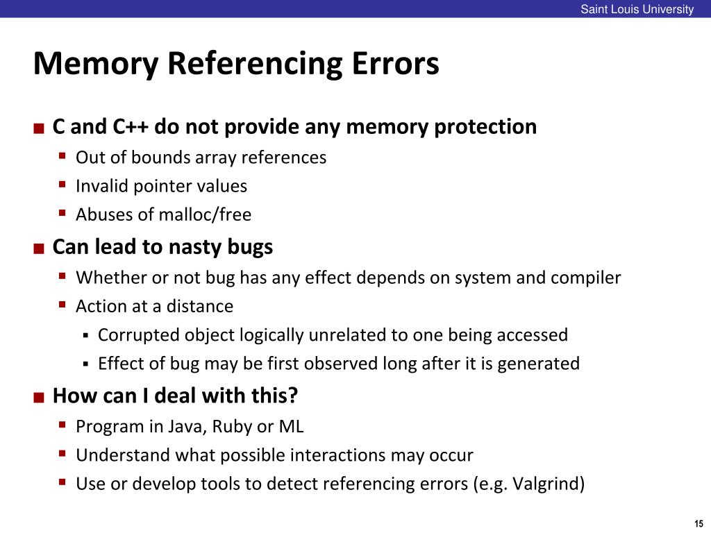 Saint Louis University Memory Referencing Errors • C and C++ do not provide any memory protection • Out of bounds array references • Invalid pointer values • Abuses of malloc/free • Can lead to nasty bugs • Whether or not bug has any effect depends on system and compiler • Action at a distance • Corrupted object logically unrelated to one being accessed • Effect of bug may be first observed long after it is generated • How can I deal with this? • Program in Java, Ruby or ML • Understand what possible interactions may occur • Use or develop tools to detect referencing errors (e.g. Valgrind)