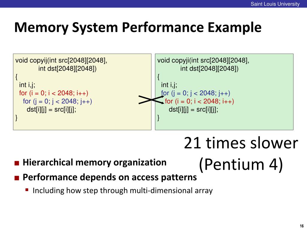 Saint Louis University Memory System Performance Example • Hierarchical memory organization • Performance depends on access patterns • Including how step through multi-dimensional array void copyij(int src[2048][2048], int dst[2048][2048]) { int i,j; for (i = 0; i < 2048; i++) for (j = 0; j < 2048; j++) dst[i][j] = src[i][j]; } void copyji(int src[2048][2048], int dst[2048][2048]) { int i,j; for (j = 0; j < 2048; j++) for (i = 0; i < 2048; i++) dst[i][j] = src[i][j]; } 21 times slower(Pentium 4)