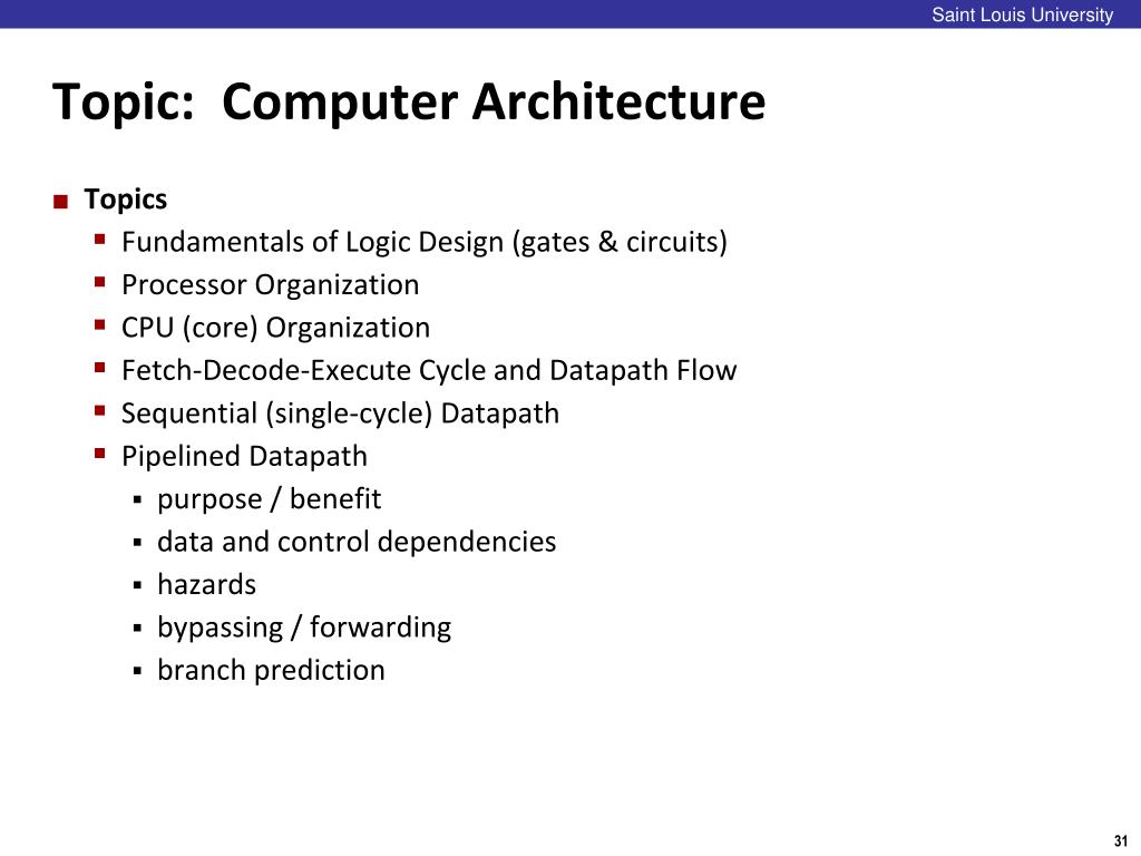 Saint Louis University Topic: Computer Architecture • Topics • Fundamentals of Logic Design (gates & circuits) • Processor Organization • CPU (core) Organization • Fetch-Decode-Execute Cycle and Datapath Flow • Sequential (single-cycle) Datapath • Pipelined Datapath • purpose / benefit • data and control dependencies • hazards • bypassing / forwarding • branch prediction