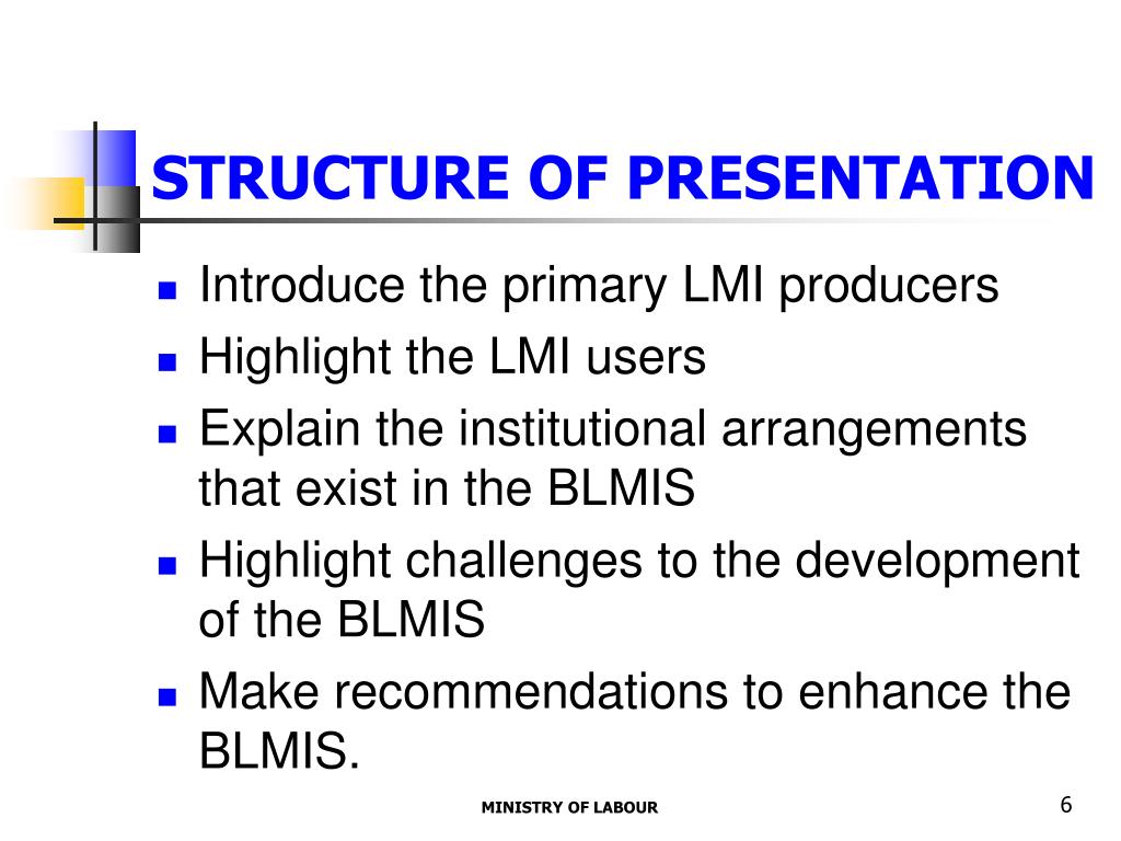 STRUCTURE OF PRESENTATION • Introduce the primary LMI producers • Highlight the LMI users • Explain the institutional arrangements that exist in the BLMIS • Highlight challenges to the development of the BLMIS • Make recommendations to enhance the BLMIS. MINISTRY OF LABOUR