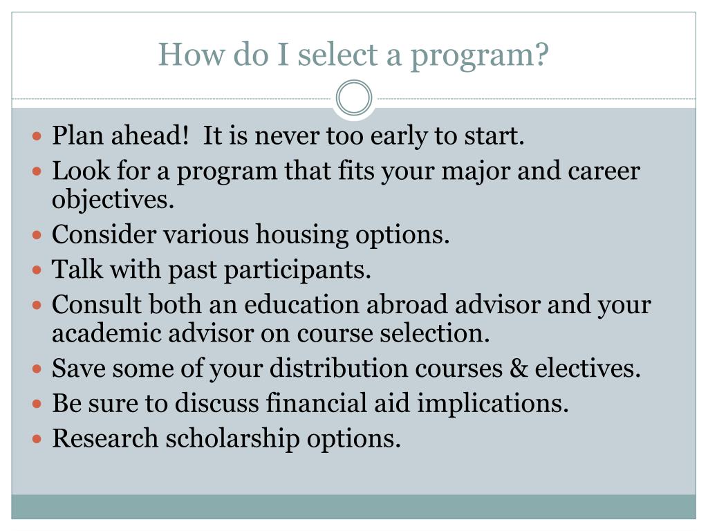 How do I select a program? Plan ahead! It is never too early to start. Look for a program that fits your major and career objectives. Consider various housing options. Talk with past participants. Consult both an education abroad advisor and your academic advisor on course selection. Save some of your distribution courses & electives. Be sure to discuss financial aid implications. Research scholarship options.