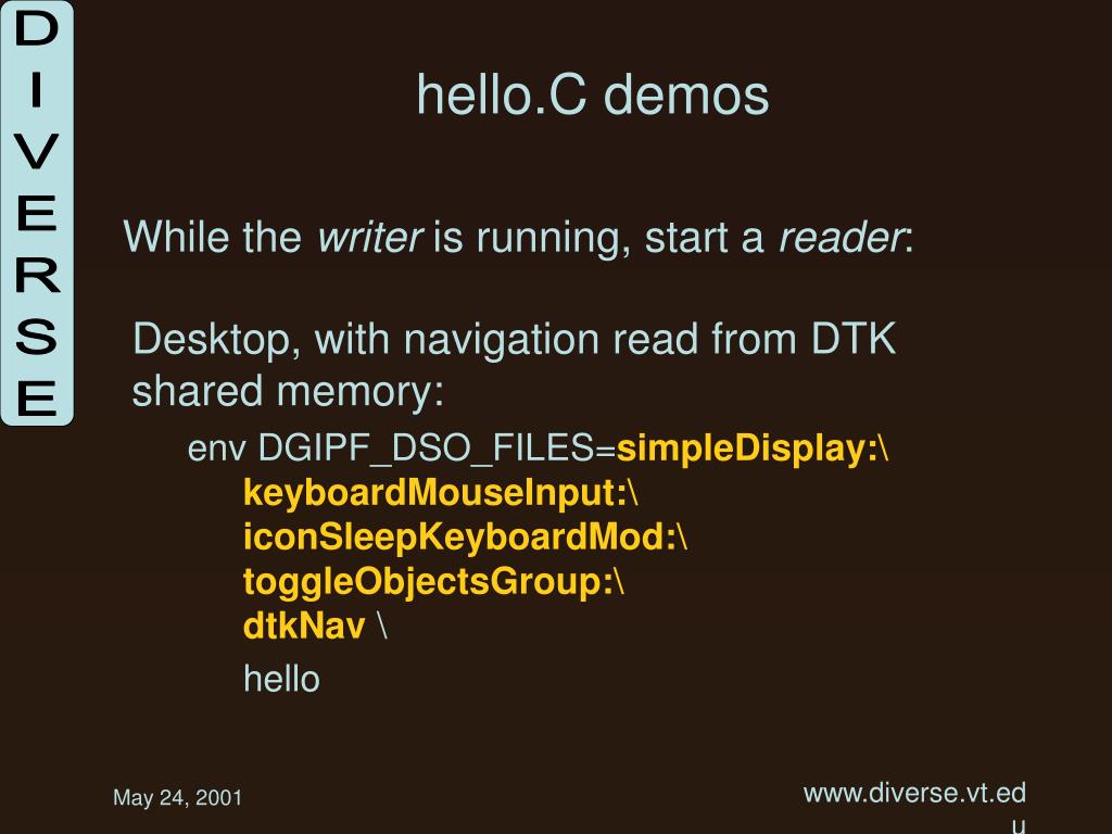 hello.C demos • While the writer is running, start a reader: Desktop, with navigation read from DTK shared memory: env DGIPF_DSO_FILES=simpleDisplay:\ • keyboardMouseInput:\ • iconSleepKeyboardMod:\ • toggleObjectsGroup:\ • dtkNav \ hello