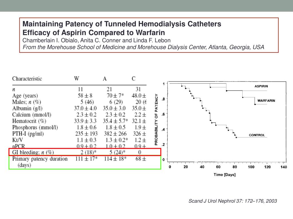 MaintainingPatencyofTunneledHemodialysisCatheters Efficacyof Aspirin ComparedtoWarfarin Chamberlain I. Obialo, Anita C. Conner and Linda F. Lebon FromtheMorehouse School ofMedicineandMorehouseDialysis Center, Atlanta, Georgia, USA Scand J Urol Nephrol 37: 172–176, 2003